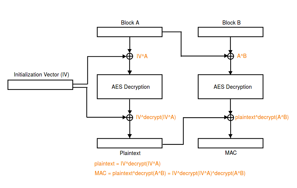 我们主要关注于解密,这里我们并不知道 IV 和 key。这里我们假设密文块的长度为 n 个字节。