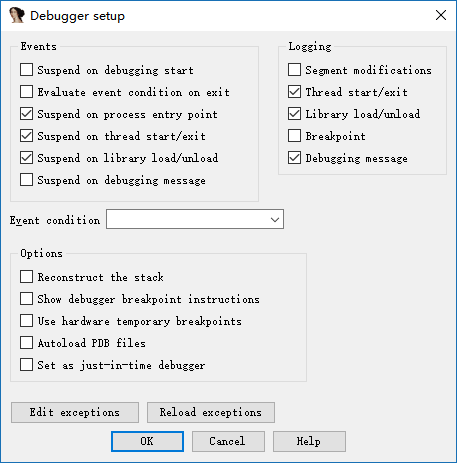 主要是选择了三个 Events,使得我们的程序可以在入口点,线程启动时,library加载时自动停止。当然,也可以都进行选择。