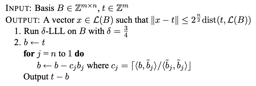 该算法输入一组格L(秩为n)的基B和一个目标向量\mathbf{t},输出CVP问题的近似解。