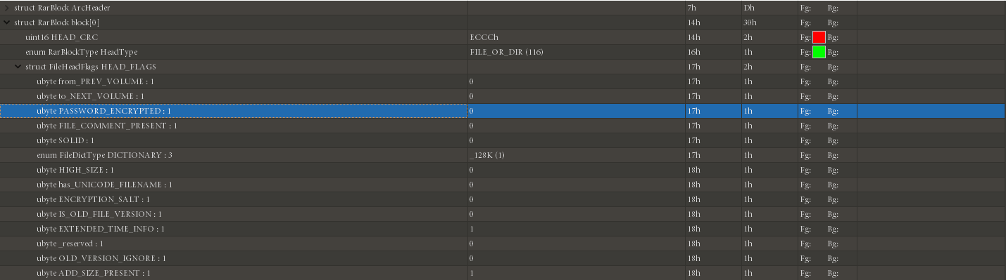 | HIGH_PACK_SIZ | 4 | High 4 bytes of 64-bit value of compressed file size. Optional value, presents only if bit 0x100 in HEAD_FLAGS is set. |