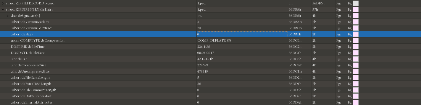在上文 ZIP 格式中的 核心目录区 中,我们强调了一个叫做通用位标记 (General purpose bit flag) 的 2 字节,不同比特位有着不同的含义。