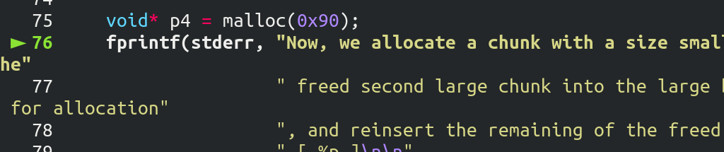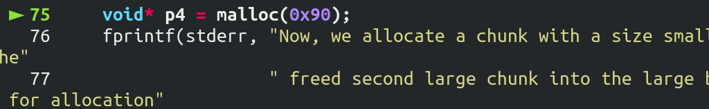 fprintf(stderr, "Now, we allocate the first large chunk on the heap at: %p\n", p1 - 2);