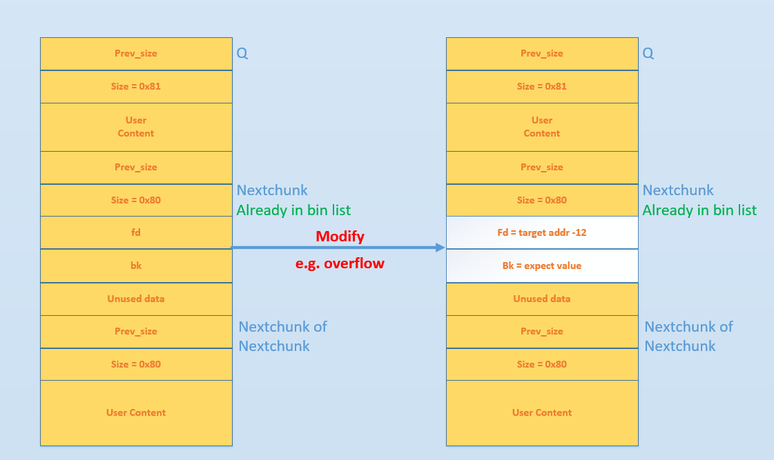 现在有物理空间连续的两个 chunk(Q,Nextchunk),其中 Q 处于使用状态、Nextchunk 处于释放状态。那么如果我们通过某种方式(比如溢出)将 Nextchunk 的 fd 和 bk 指针修改为指定的值。则当我们free(Q)时