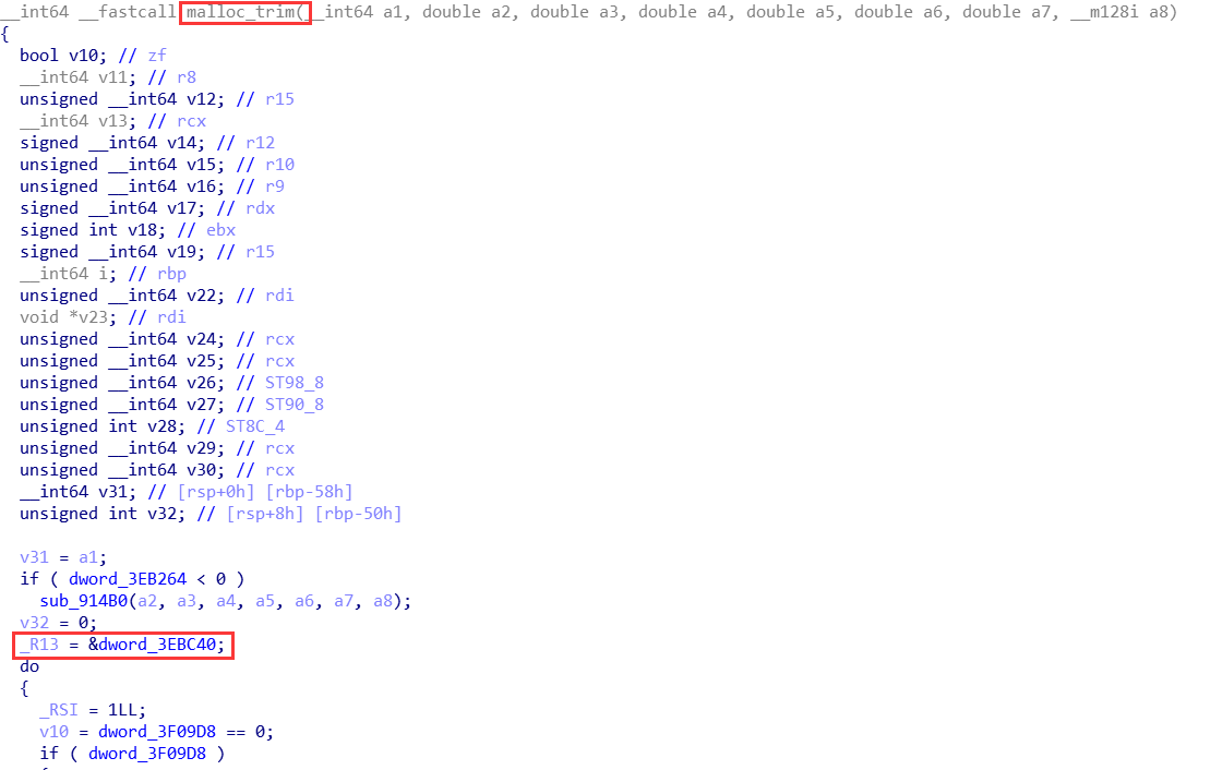 注意到 mstate ar_ptr = &main_arena; 这里对 main_arena 进行了访问,所以我们就可以通过 IDA 等工具分析出偏移了。