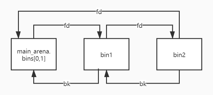 Unsorted Bin 在管理时为循环双向链表,若 Unsorted Bin 中有两个 bin,那么该链表结构如下