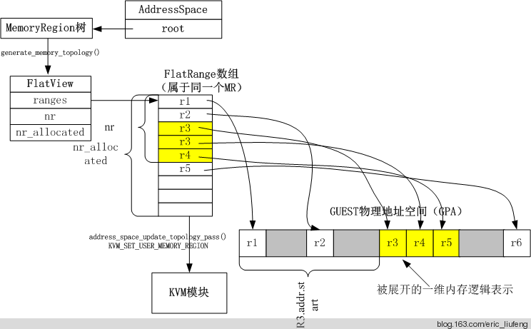 FlatView 用来表示一棵 MemoryRegion 树所表示的 Guest 地址空间,其使用一个 FlatRange 结构体指针数组来存储不同 MemoryRegion 对应的地址信息,每个 FlatRange 表示单个 MemoryRegion 的 Guest 视角的一块物理地址空间以及是否只读等特性信息, FlatRange 之间所表示的地址范围不会重叠。