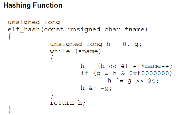 bucket 数组包含了 nbucket 个元素,chain 数组包含了 nchain 个元素,所有的数组的下标都是以 0 开始。bucket 和 chain 都包含符号表索引。chain 数组中的元素是和符号表中的元素一一对应的,因此符号表的元素个数必须和 nchain 的大小相同,故而符号表的索引同样可以作为 chain 表的索引。下面展示的哈希函数接受一个符号名作为输入,然后返回一个值,这个值可能被用于计算 bucket 的索引。因此,如果哈希函数针对于某个名字返回值 x,那么 bucket[x%nbucket] 给出了一个索引 y,可以用来索引符号表,也可以用来索引 chain 表。如果符号表的对应索引并不是所想要的哪一个,那么 chain[y] 就会给出同一个哈希值的下一个符号表中表项的位置,即可以用来防止出现哈希值一样的情况。因此我们可以跟着 chain 链一直搜索直到遇到所想要的符号,或者遇到值为 STN_UNDEF 的 chain 的表项。