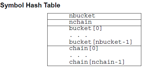 ELF 文件中的哈希表由 Elf32_Word 对象构成,用来支持符号表访问。下面的符号可以用来辅助解释符号表的组织情况,但是他们并不是 ELF 文件说明的一部分。
