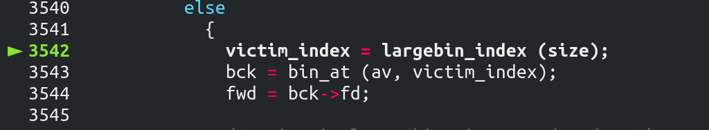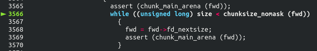 在一个序列的 large bin chunk 中 fd_nextsize 的方向是 size 变小的方向。这个循环的意思是找到一个比当前 fwd 指的 chunk 要大的地址,存入 fwd 中。