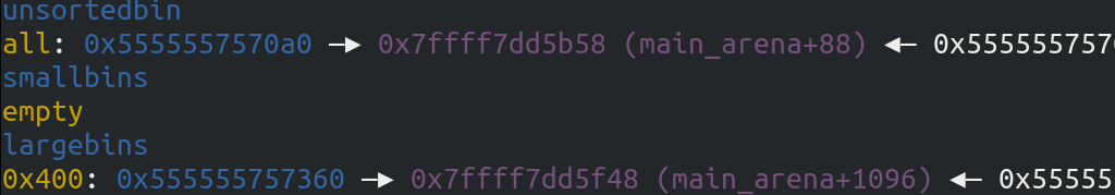 至此利用完毕。由于最后分配的还是 small bin 中的 chunk,与 large bin 中的 chunk 也无关了。