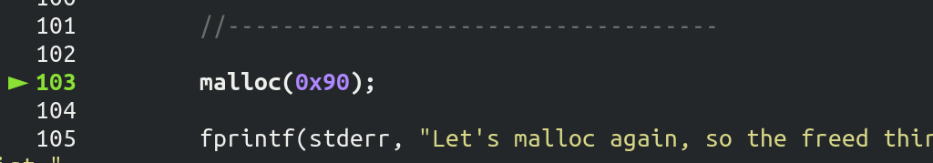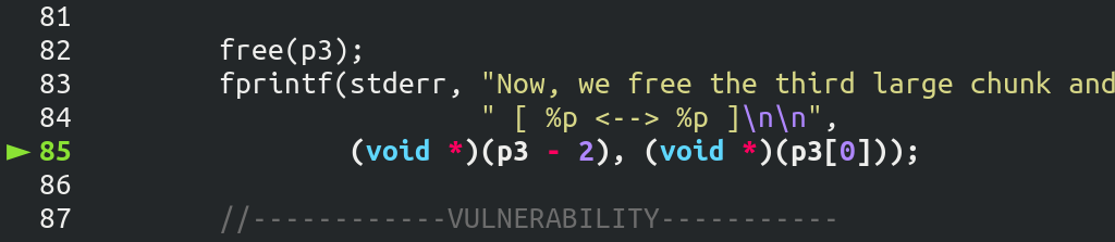 fprintf(stderr, "Now, we allocate the first large chunk on the heap at: %p\n", p1 - 2);
