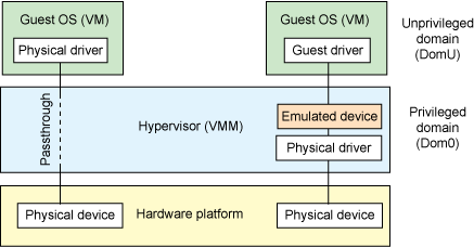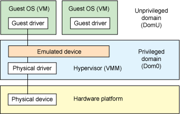 平台设备模拟即由 Hypervisor 负责模拟虚拟设备的功能,不同的虚拟化软件对于模拟设备的实现方式不同。