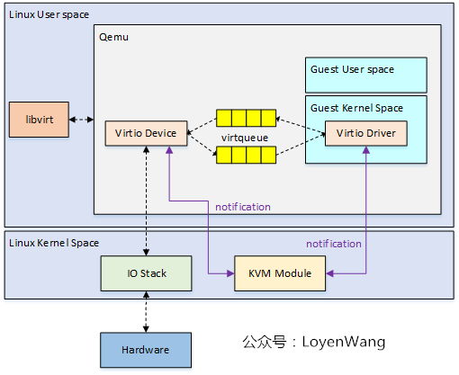 virtio 这个概念来自于一篇非常古老的虚拟化领域的论文:virtio: towards a de-facto standard for virtual I/O devices,主要是为了解决设备虚拟化的问题而提供了一套通用的虚拟化设备模型,Guest OS 只需要实现一套统一的 virtio 驱动便能以统一的方式访问虚拟化设备,从而避免了各种虚拟化驱动分裂的问题。