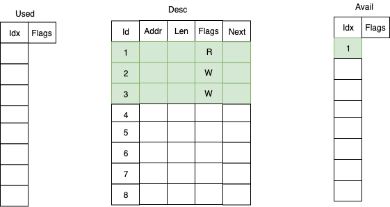 下图为由 Guest 向 Host 发送数据的一个 vring 示例: