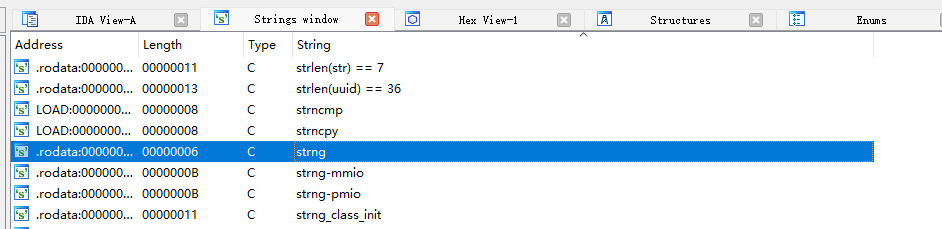 直接将 QEMU 拖入 IDA 进行分析,首先通过字符串窗口找到 "strng" ,从而找到该设备的初始化函数: