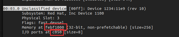 通常我们可以看到一个未被识别的设备,这通常便是题目设备。这里我们可以看到 PMIO 地址为 0xc050,MMIO 地址(物理地址)为 0xfebf1000:
