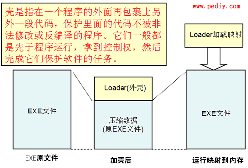 - 处于保护源程序代码和数据的目的,一般会加密源程序文件的各个区块。在程序执行时外壳将这些区块数据解密,以让程序正常运行