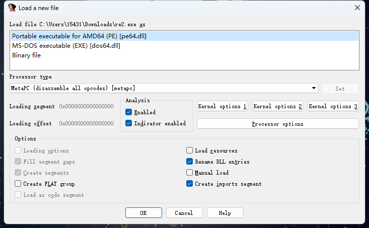 最简单的使用方式是将待逆向的二进制可执行文件直接拖放到 IDA 上,IDA会自动识别文件类型,这一步通常不需要做改动,直接点击 🆗 即可: